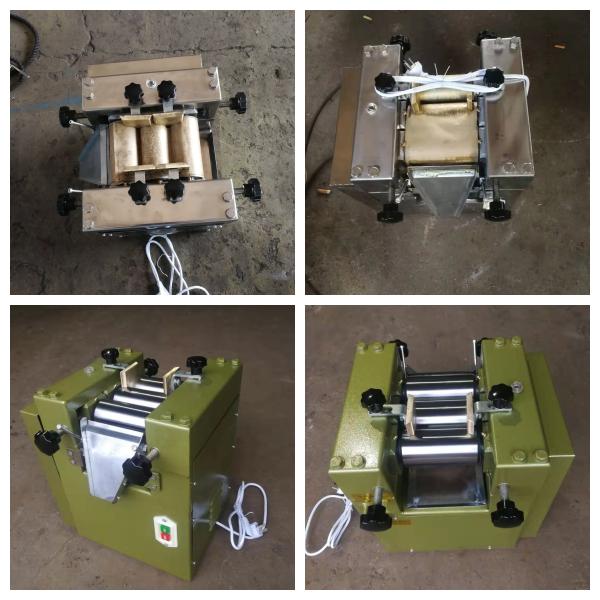 The machine achieves the grinding effect through the horizontal three rollers' surface squeezing each other and friction at different speeds.